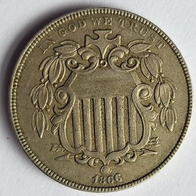 1866 Shield Nickel 1866, EF/AU 45, With Rays